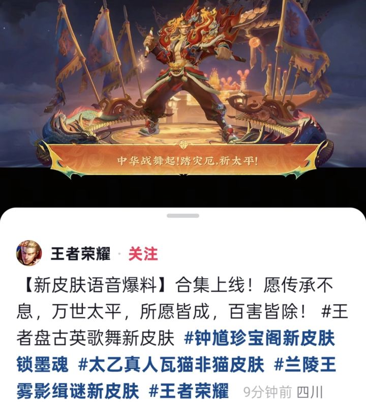 中华战舞起!踏灾厄,祈太平!王者荣耀官方账号发布新皮肤语音爆料合集,同步公开多款新春主题皮肤信息,以盘古「英歌舞」皮肤领衔,融合传统民俗与潮流设计,引爆玩家期待。