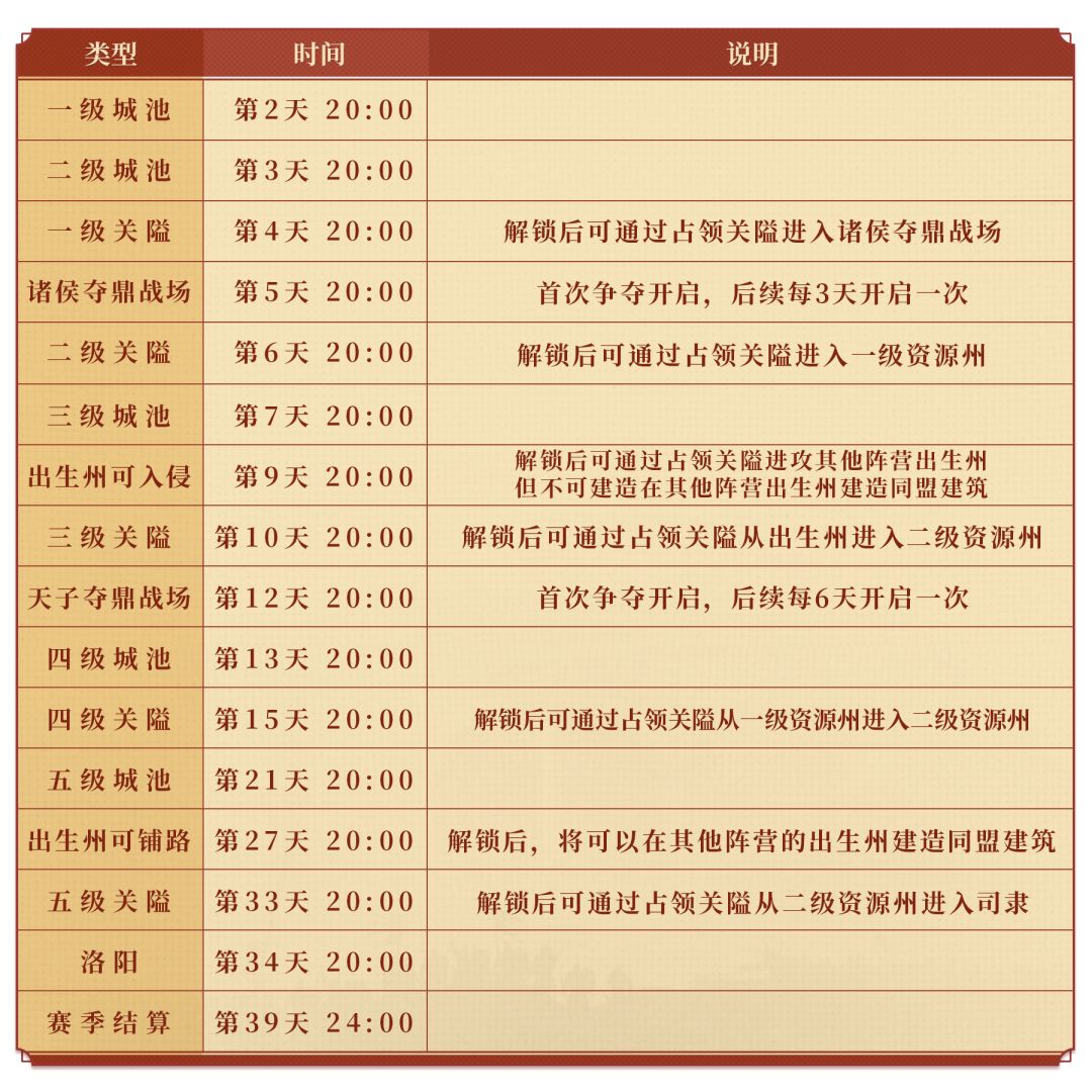 A:XP1赛季的赛季节奏已经整体提前,会有更紧凑自由的战斗体验。相较于S赛季,整体开关节奏已经有加快,主公可以参考下方时间点。