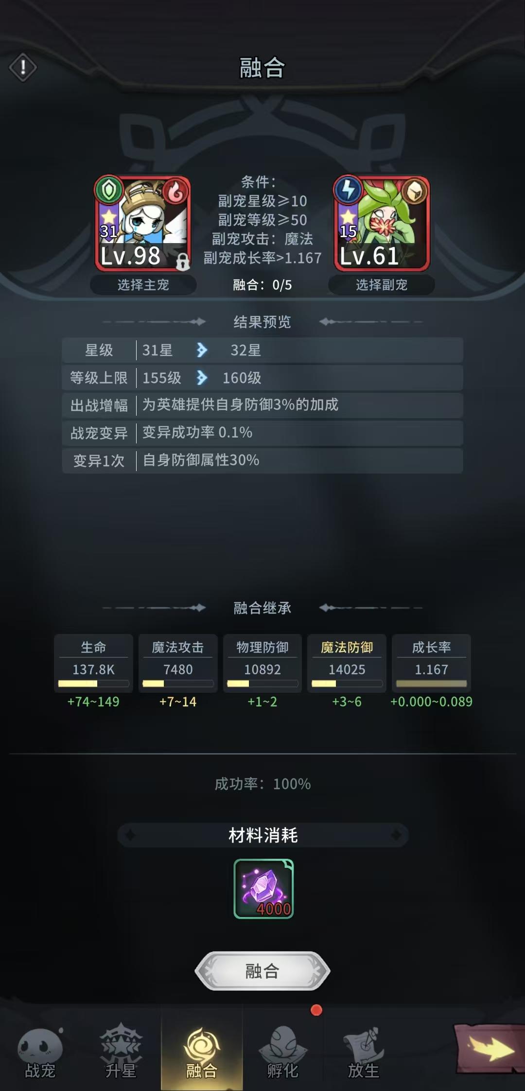 -每次融合有60%概率提升主宠的成长率,提升上限由副宠的成长率决定