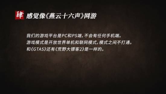 对于游戏感觉像是《燕云十六声》,官方则表示,《金庸群侠传》是PC和PS游戏,不会登陆手机端,游戏模式则是开放世界单机和联网模式,模式之间不打通,和《三男一狗》和《荒野大镖客2》是一样的。