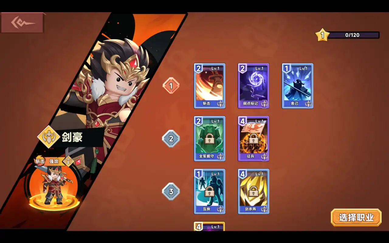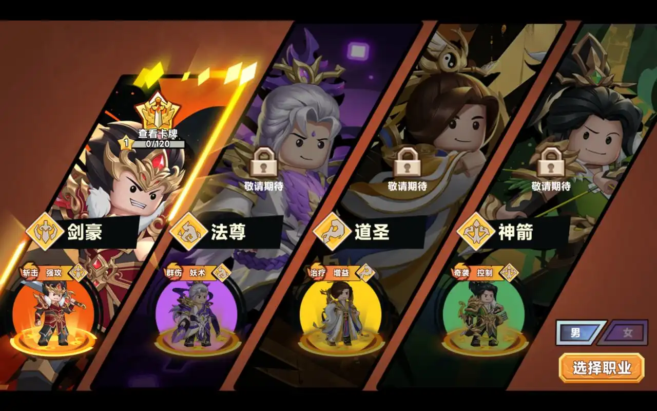 本作中有着四种职业(剑豪、法尊、道圣、神箭)可供选择,每种职业通过对局升级又可以解锁各种初始卡牌搭配。