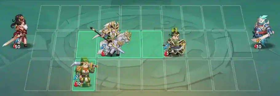每张卡牌还有品质与特点之分,比如说马超骑在马上一次可以走四格、盾兵血厚但一次只能走一格,辅助型例如加血的可以放前排后面等。