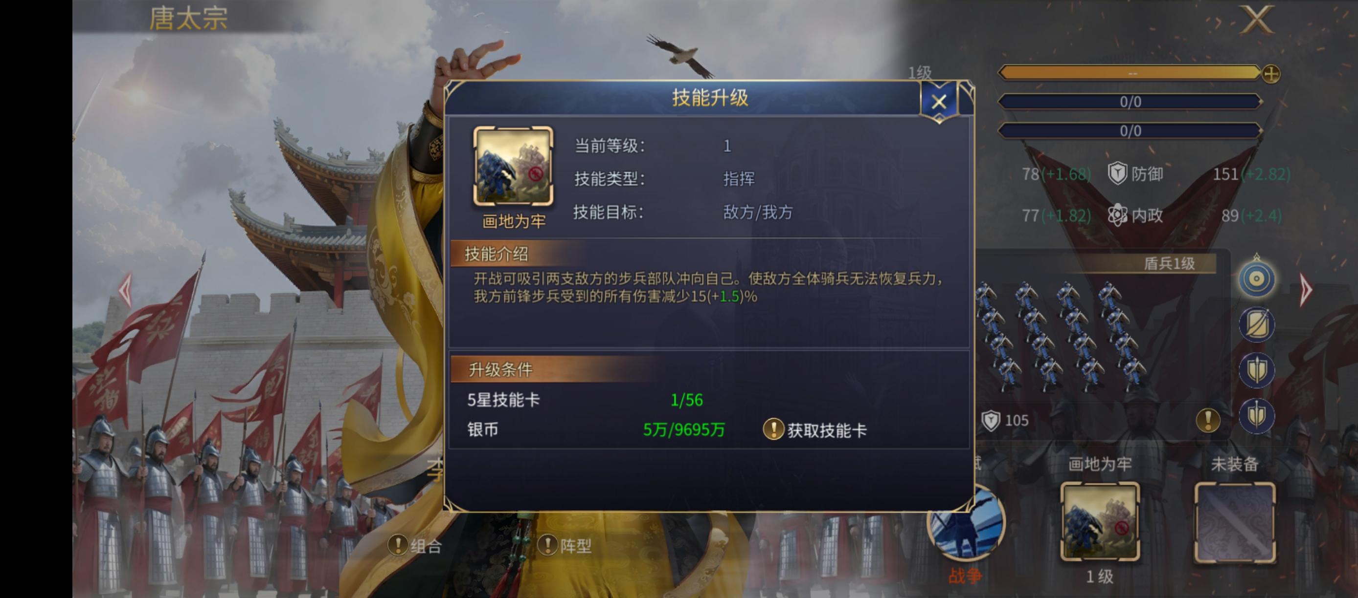 太宗老技能:使敌方全体骑兵无法恢复兵力,我方前锋步兵受到的所有伤害减少15(+1.5)%。