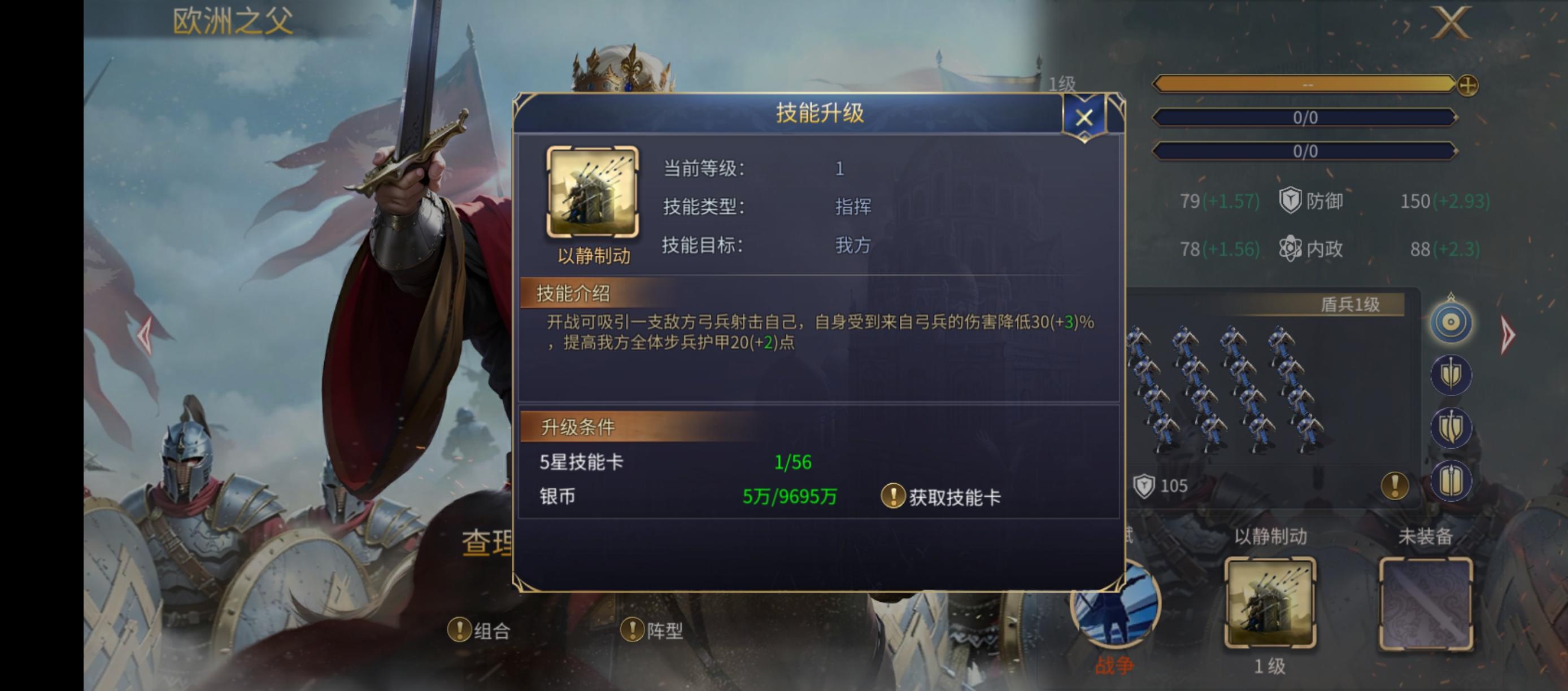 欧洲之父新技能:开战可吸引一支敌方弓兵射击自己,自身受到来自弓兵的伤害降低30(+3)%,提高我方全体步兵护甲20(+2)点