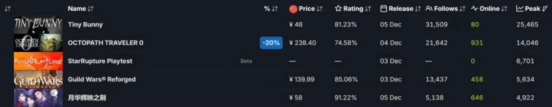 再次看到《月华辉映之刻》的名字,是在数据平台SteamDB上。12月5日周五才上线的它,迅速冲上当周Steam热销榜TOP5。