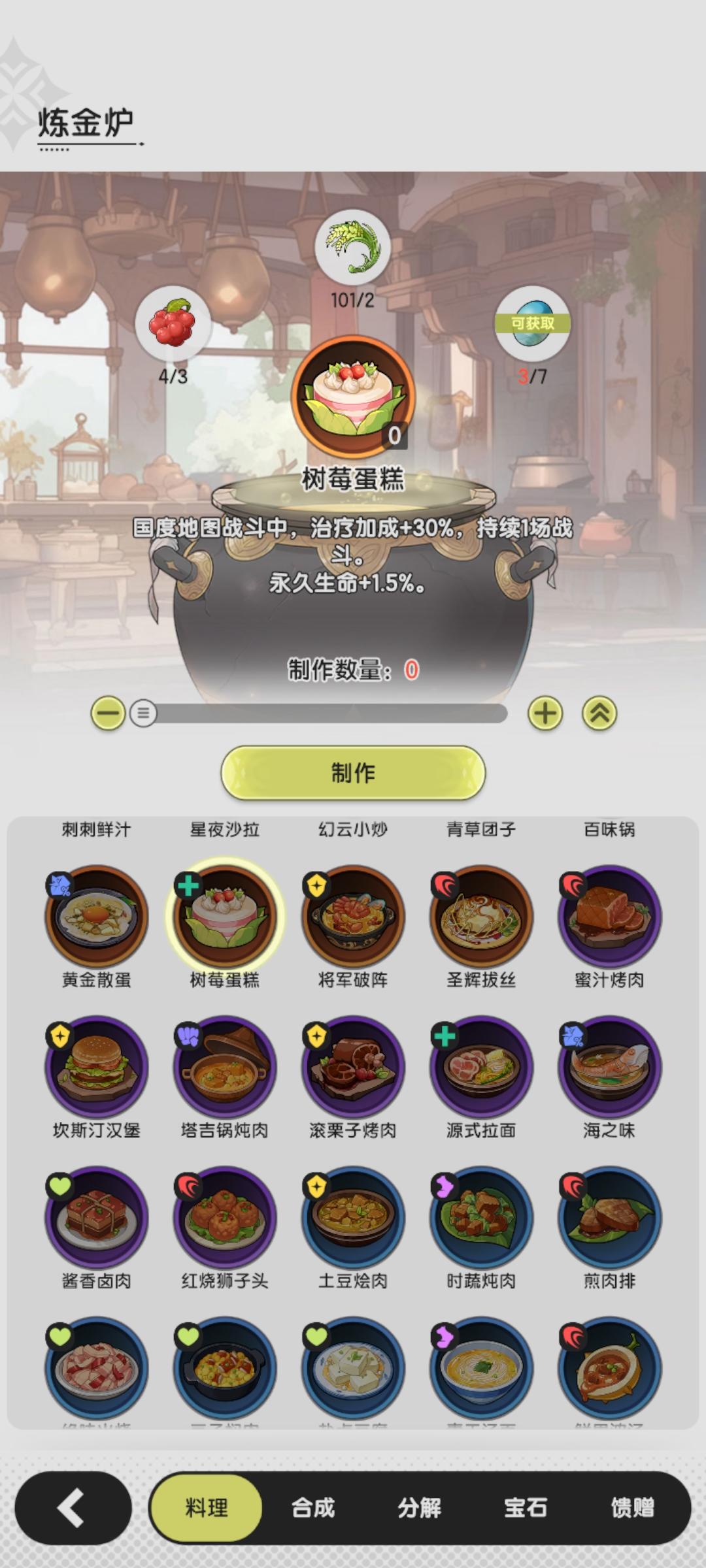 然后越战推图时,雕像我们找睿智贤者拿攻击力加成是可以的,但是料理就不要选择会心格挡,伤害类的料理,经过我的测试,我们吃源式拉面树莓蛋糕等加治疗加成的料理更容易过