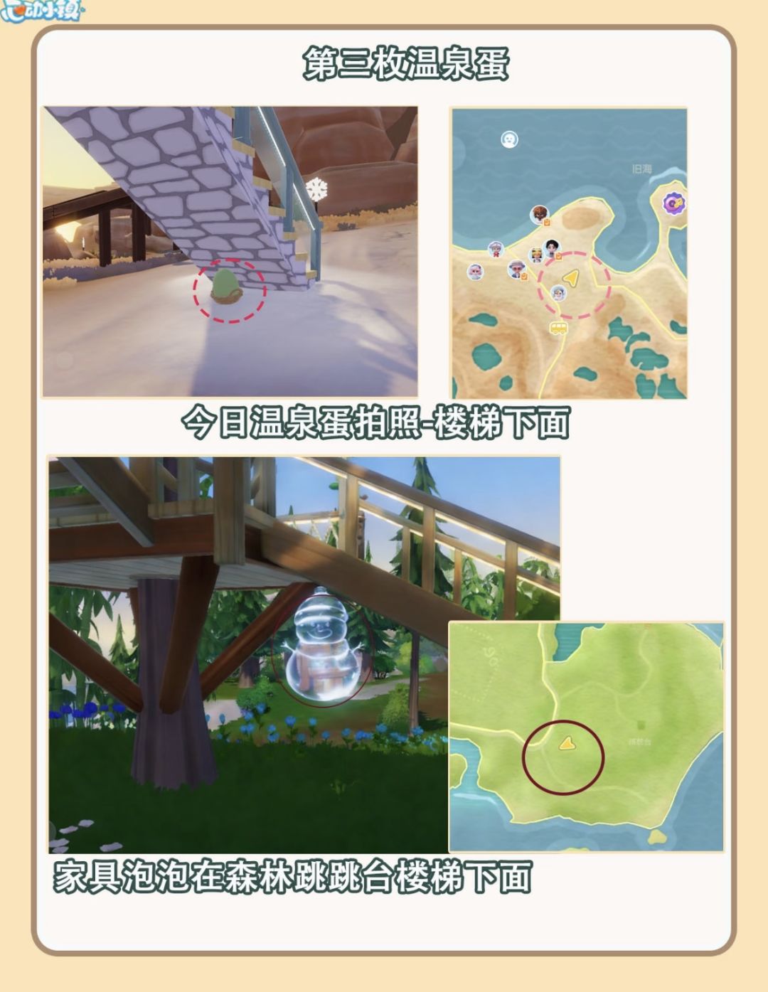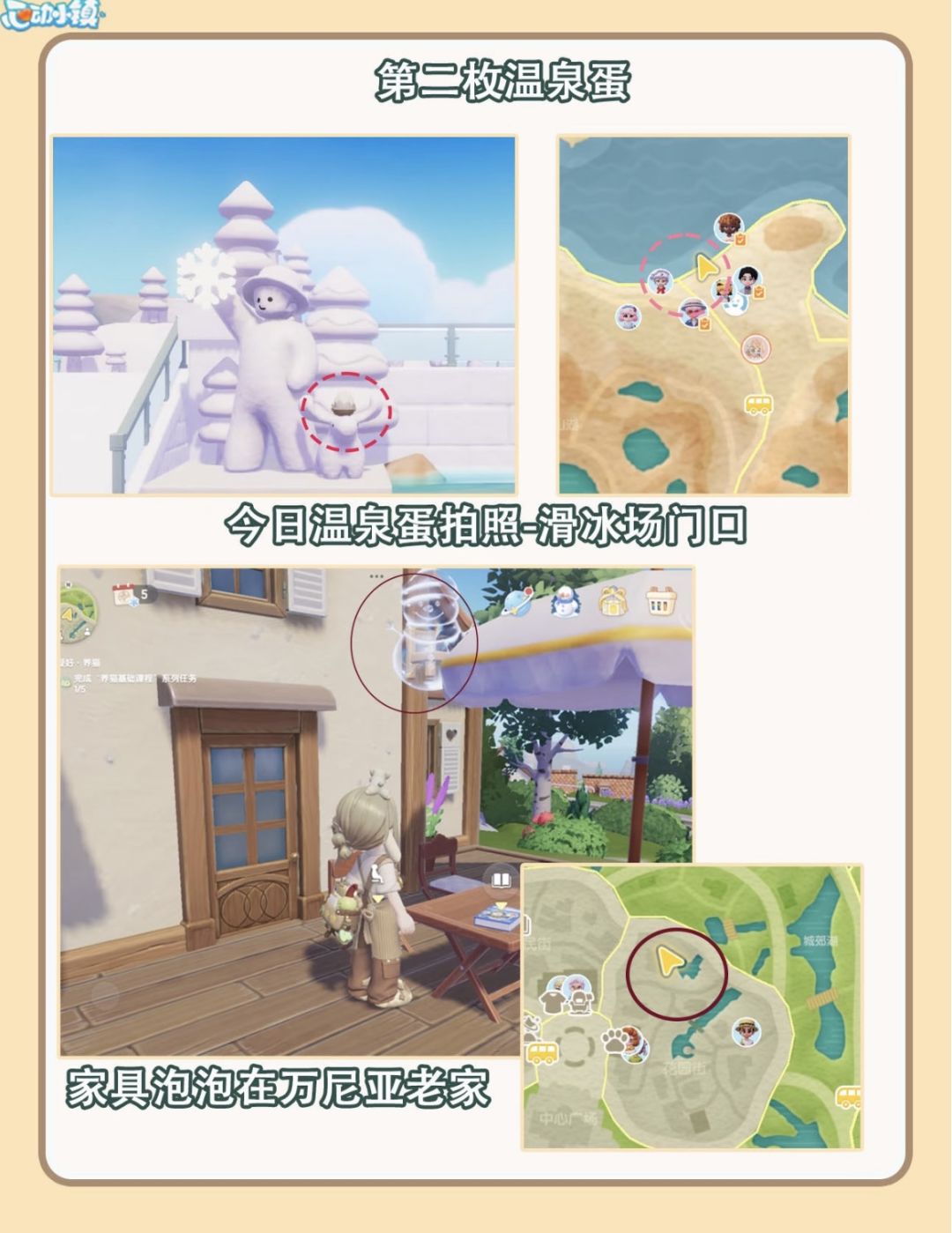 小镇居民们注意啦!2月4日温泉蛋家具泡泡位置已更新——就在文艺街入口,靠近钢琴台的旁边!记得拍照+顶泡泡,轻松get今日份家具奖励✨