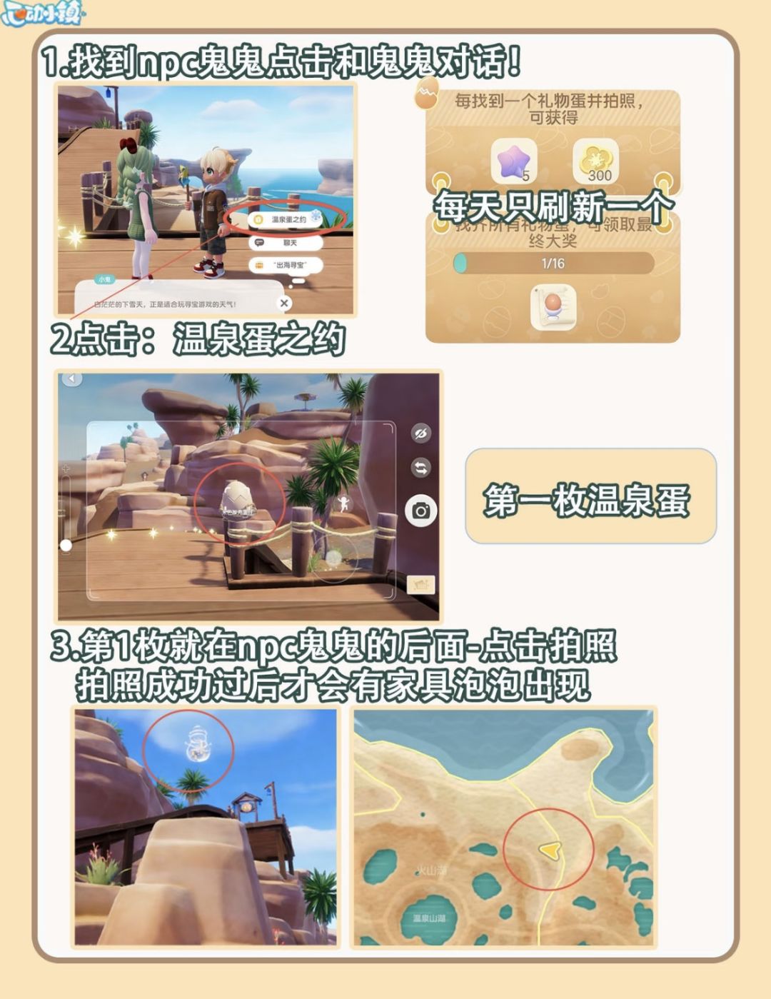 还没开始收集的宝子,现在上车还来得及!跟着攻略一天一蛋,轻松薅满活动奖励~今天你去文艺街打卡了吗?评论区晒出你的温泉蛋美照!