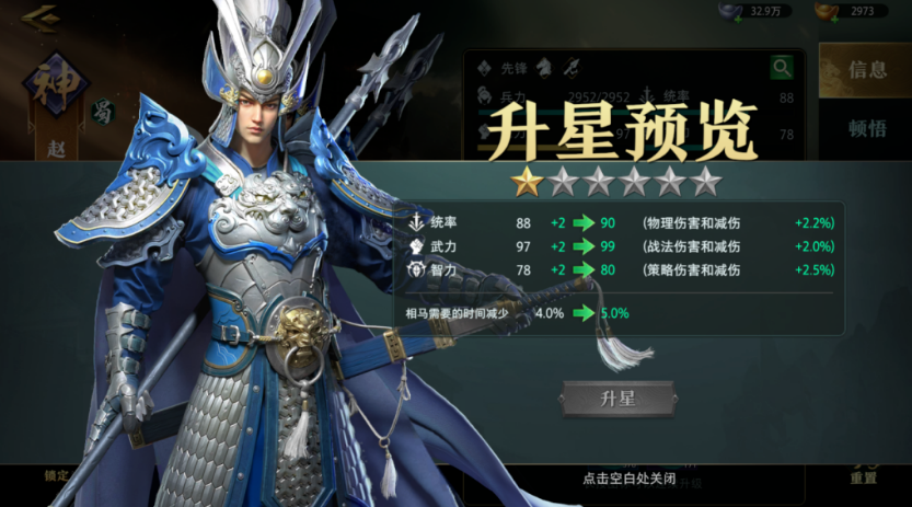 武将升星可增加武将的统帅、武力、智力属性效果,具体获得属性为升星消耗÷10,同时提升每个武将专属的内政效果。