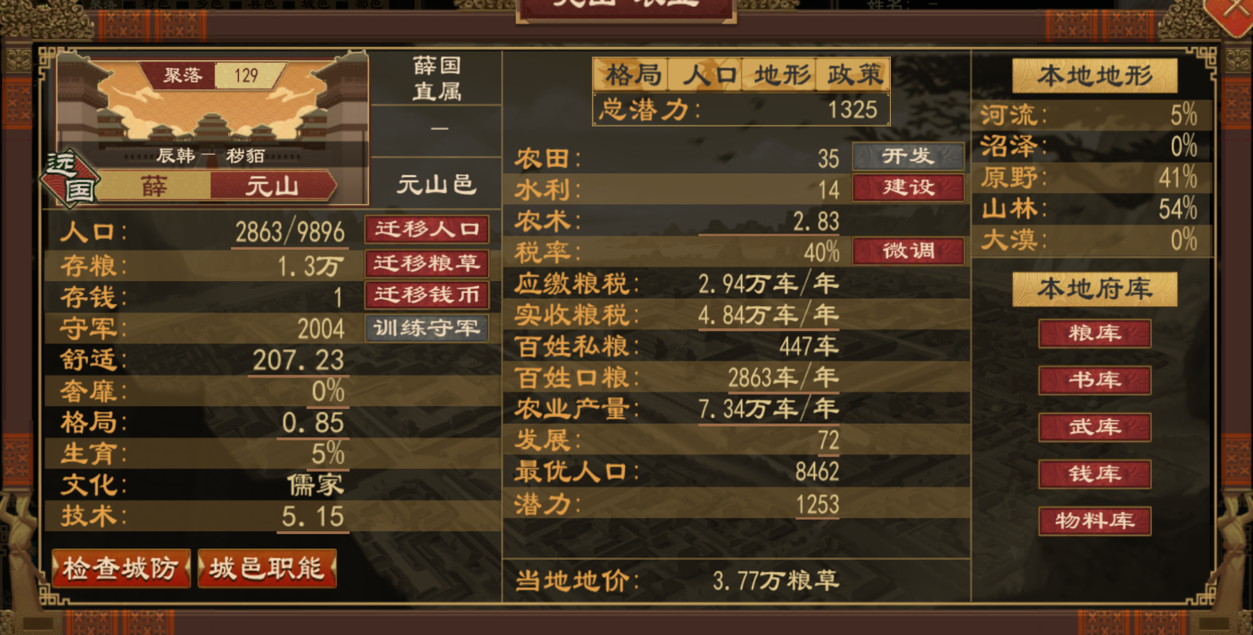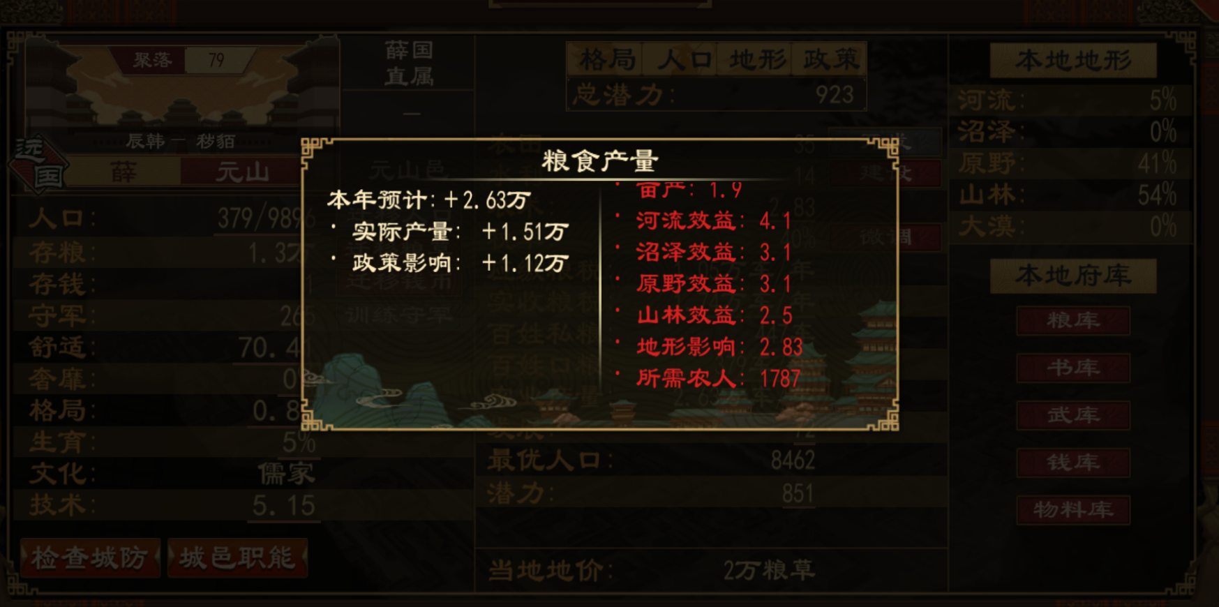 其五:国家政策,优先级:粮种、地形效益>农术、粮食产量、财政收入(并列无优先级排名)其六:国家状态等其他因素,如君主心性贪,财政收入+30%,星象历法的校正会影响粮食产量,人物能力中的耕织(粮食产量+5%),郡守治理方针"传授农术"加本郡各城粮产。