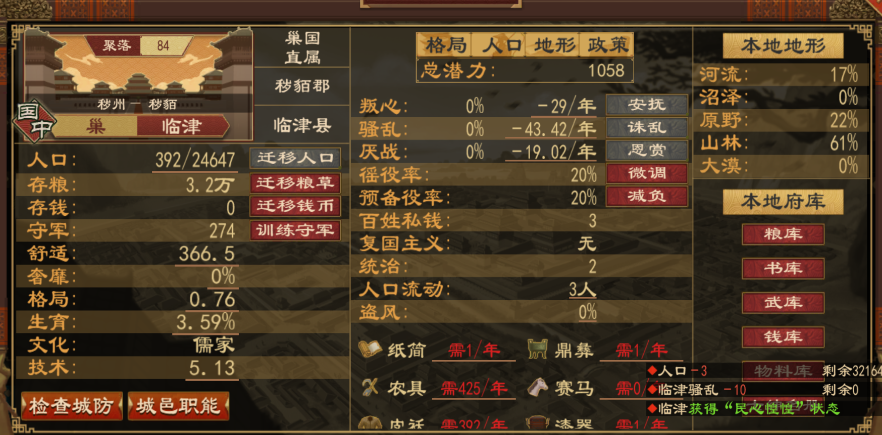 其四是骚乱,就是骚乱损失,骚乱高,会损失一部分粮食。点击诛乱会造成人口损失,会对粮食征收也有一定影响。(点击诛乱还有有大约一年的减2%城邑生育率)