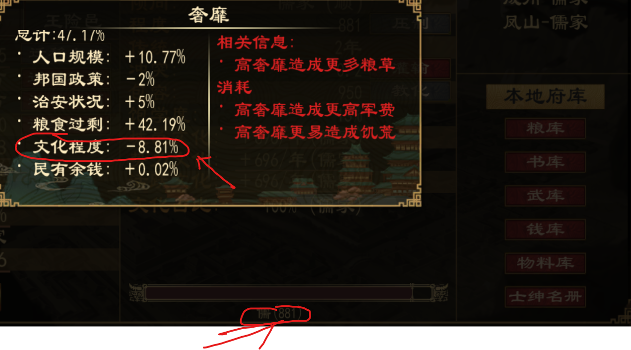 一可以通过增加文化总容量(文化总容量要有文化,空的不计算在内,操作方法朝堂一公府律令一文化容量或点击城邑一文化一点击包容中的教化),其数值为文化总容量(要有文化!!!)%,比如881总容量,减8.81%的奢靡。