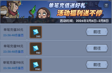 活动期间完成单笔30、98、198元档位充值可以领取高额返利!(仅限30、98、198元档位,其他档位无法满足活动条件哦~)