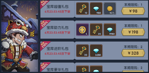 超值礼包中限时上架神之宝库礼包,海量道具材料供应!