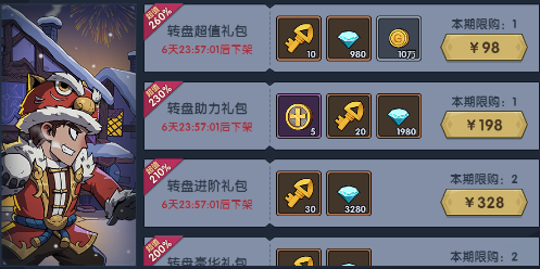超值礼包中限时上架转盘礼包,海量道具材料供应!
