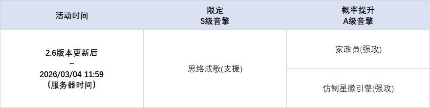 活动期间,限定S级音擎[思络成歌(支援)]以及A级音擎[家政员(强攻)]、[仿制星徽引擎(强攻)]的调频获取概率将大幅提升!