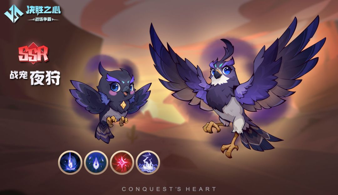 【战宠背景】夜狩是伴着暗火降生的紫羽枭鹰,羽翼揉着夜紫与墨黑的绒光,翅尖泛着流动的幽影,只有圆亮的蓝眼眸透着点软萌锐劲。平时总在夜雾浸满林梢时出没,看着是软萌的紫羽小鸟,实则是夜林里藏着锋芒的杀手,它总能悄无声息落在猎物的后方,当紫羽轻颤时,就能凝出强大的影刃,精准划开猎物的胸口。