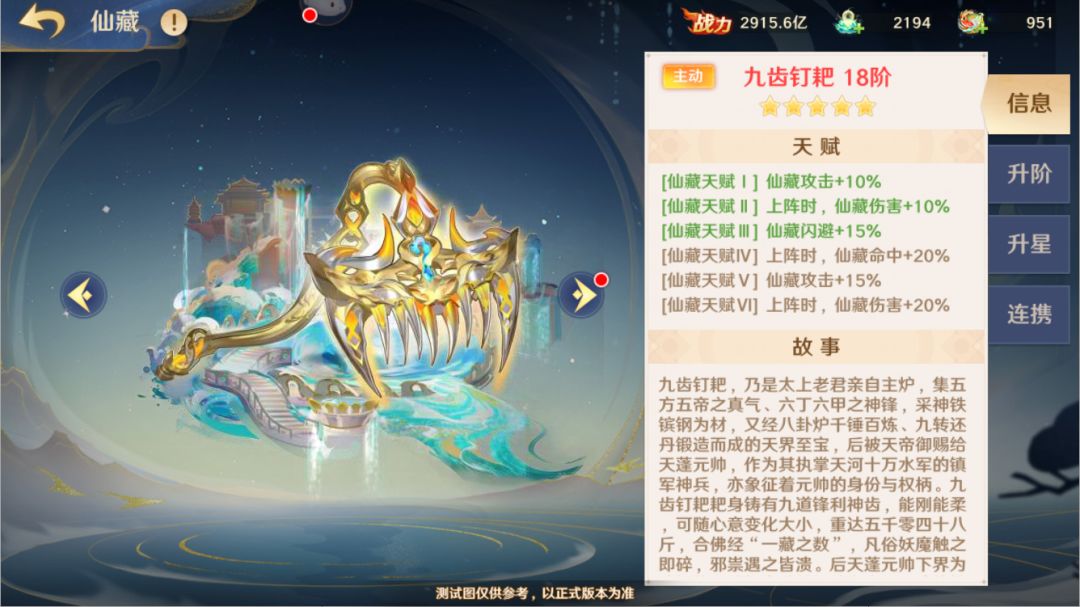 本次更新后,新增红色仙藏九齿钉耙,为守护使大人带来独特战斗效果。 九齿钉耙:冷却减少至3回合,消耗仙藏怒气减少至30;对敌方前排造成一定倍率百分比的伤害并清除其所有属性增加类状态;前2次释放时,消耗怒气减少10并使后一阵位仙藏下一次释放技能目标数+1。