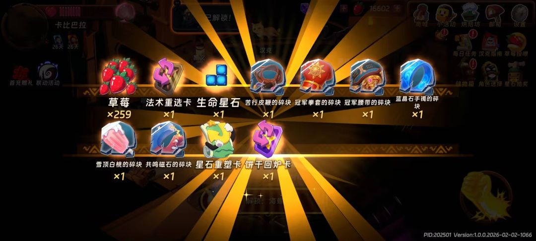 金色星矿(6小时解锁):有低概率能开到星石重塑卡(大概25%左右)和饼干回炉卡(大概10%左右概率)。