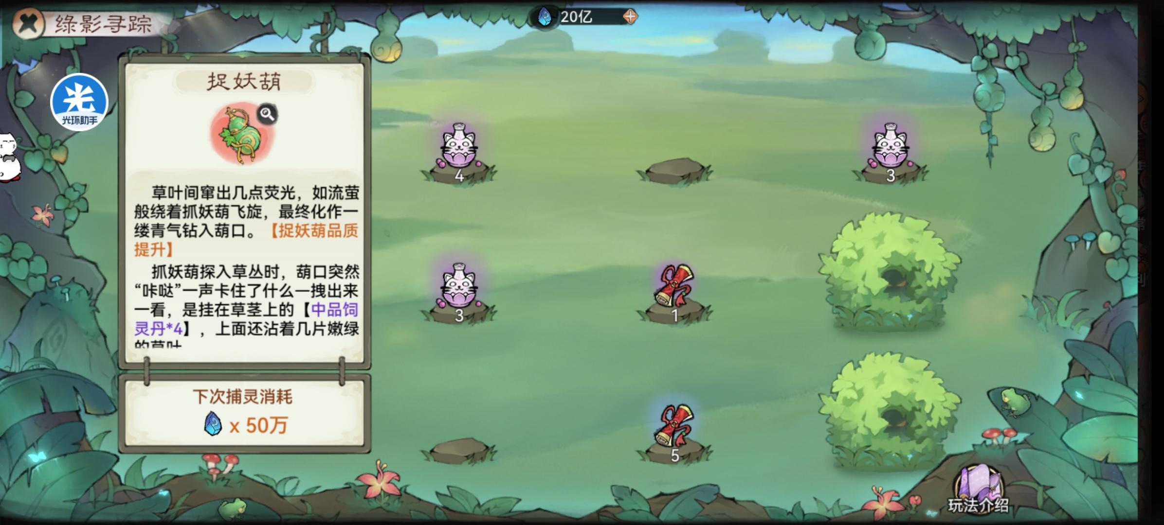 目前这里,我遇到的特殊道具有两种,一种是提升葫芦品质的,一种是提升葫芦数量的,葫芦品质直接决定捉到的灵兽品质,初始葫芦都是紫色,要升两次才能到红,有时候也不一定会有两次升品机会,但尽量祈祷晚点遇到吧,可惜这个不能决定