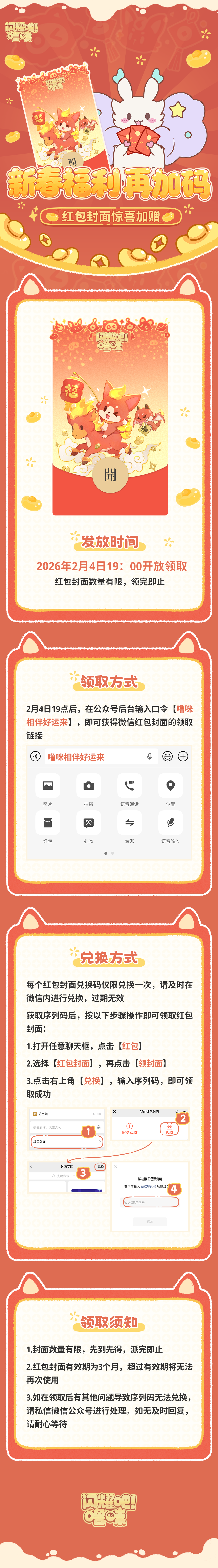 为了报答这份沉甸甸的爱意,猫鲨今天特意为冒险家们额外“加码”,【闪耀吧噜咪-马年贺岁款】红包封面惊喜加赠!