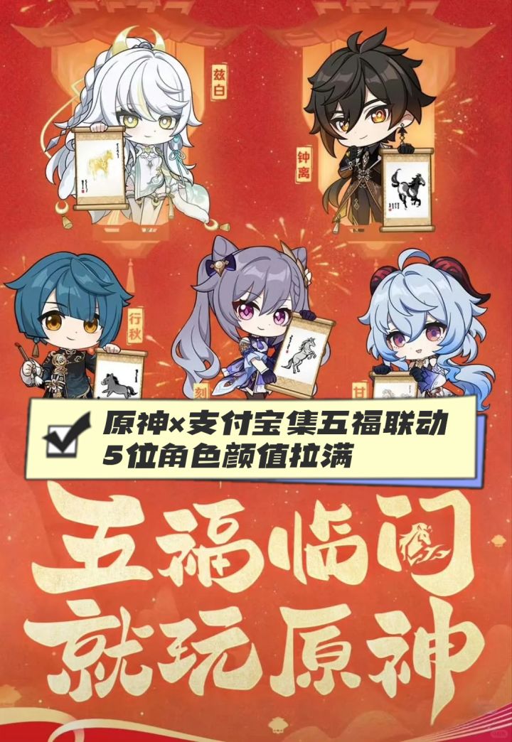 速报!昨日(2月3日)原神×支付宝集五福联动正式开启✨ 专属主题精准拿捏原神玩家,5位登场角色颜值在线,圈粉无数!#今天游戏圈发生了啥 #原神