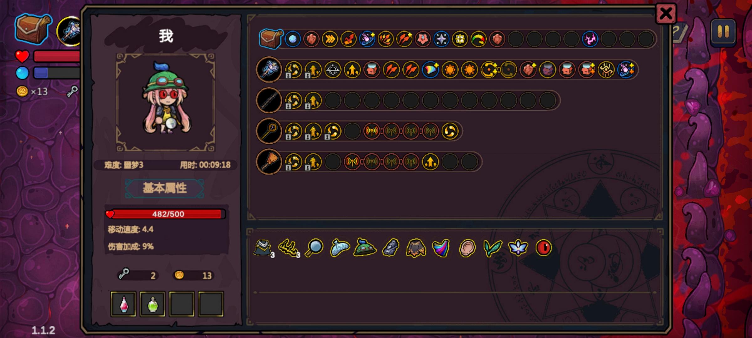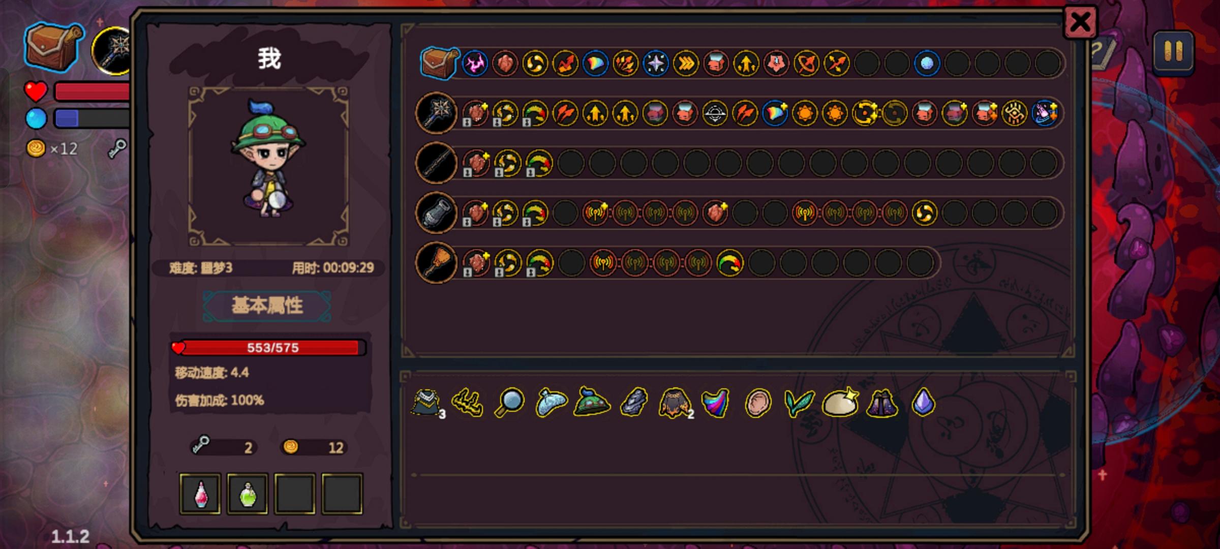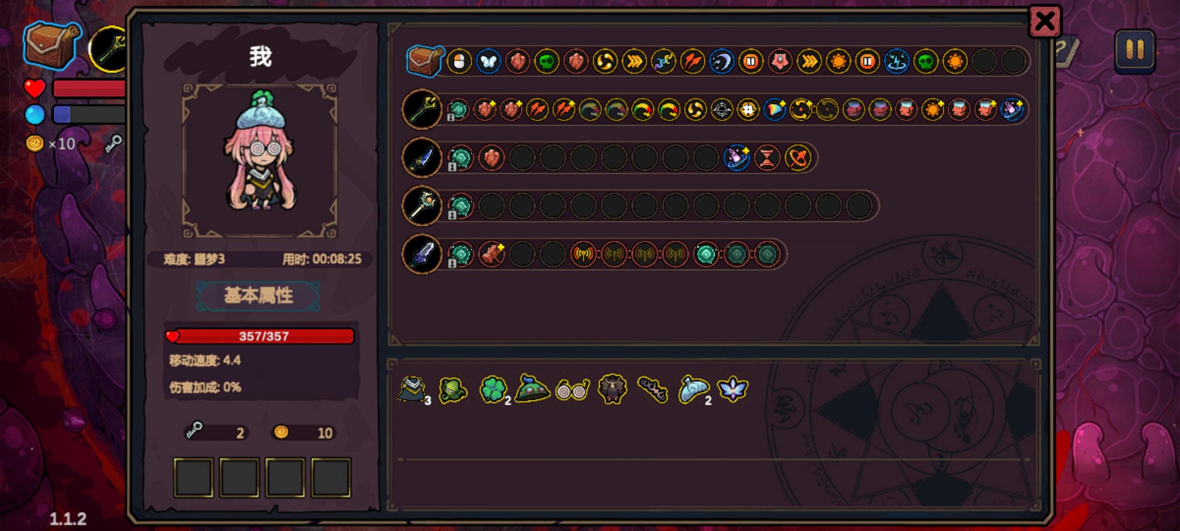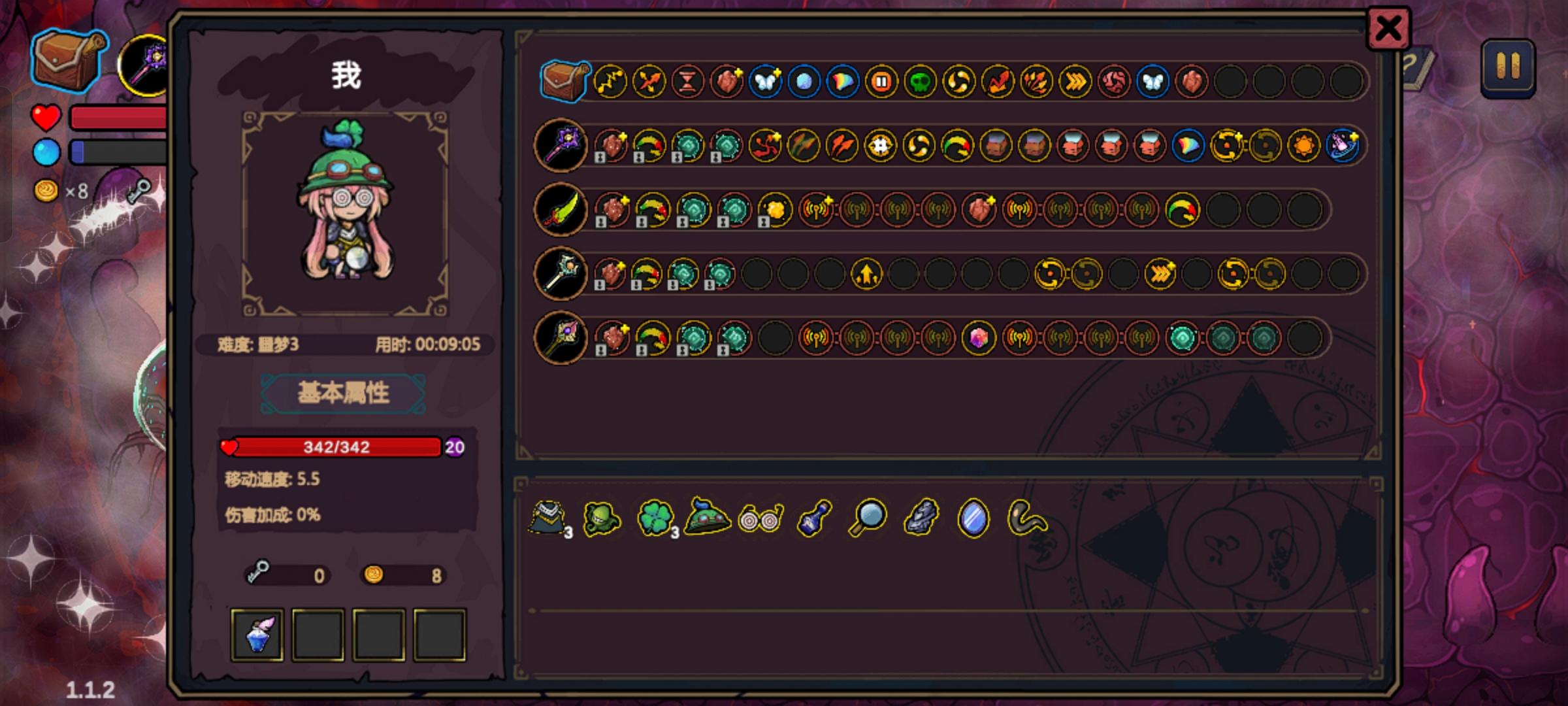 之前玩的2分钟帽子加冷却剂第一章开局,估计上限就是9分18秒了。我另外重新sl了一个开局,运气不错,第一章就有帽子和眼镜。帽子可以更快刷出泉水加工商店房,眼镜可以让你多拿一个法术,二三四章就能多拿三个法术,第二章可以选择走两三个捷径,又能多拿几个法术。第一章运气不错,拿到了屏障,这也为后面的伤害提供了一定的保障,只打精英和BOSS,主要就靠第一发次元,通过彩虹和缠绕以及双重施法后,第一发次元行者的数量很可观,能打出的伤害也很可观。