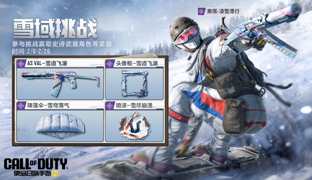 2月6日(本周五),雪域挑战活动强势开启。战士们参与挑战,即可赢取史诗级武器AS VAL-雪道飞瀑、史诗级角色奥塔-凌雪瀑行等精美奖励啦~