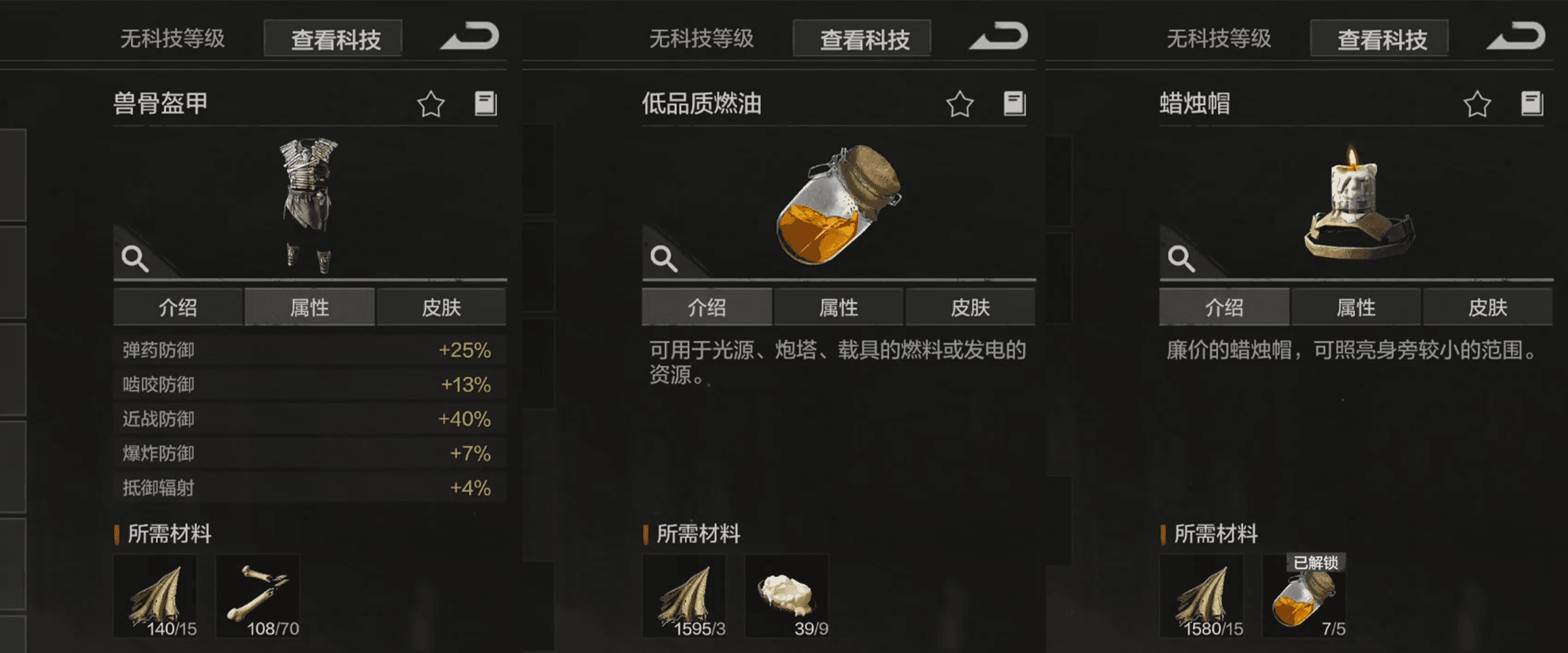 用这些材料直接制作一套兽骨盔甲,防御拉满,前期抗揍完全够用。接着再合成一些低品质燃油,后期开火车能用得上。最后一定要做一个蜡烛帽用来照明,地铁里面漆黑一片,没有照明根本寸步难行。