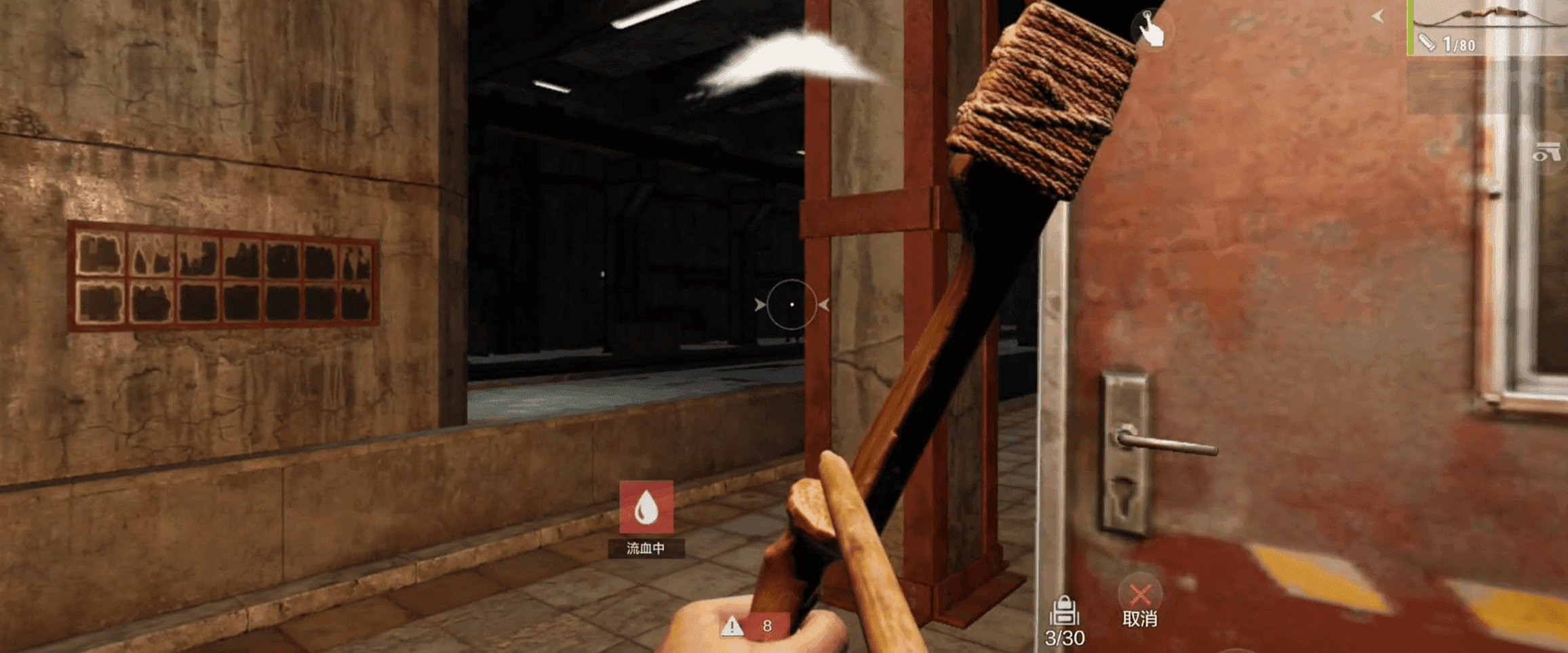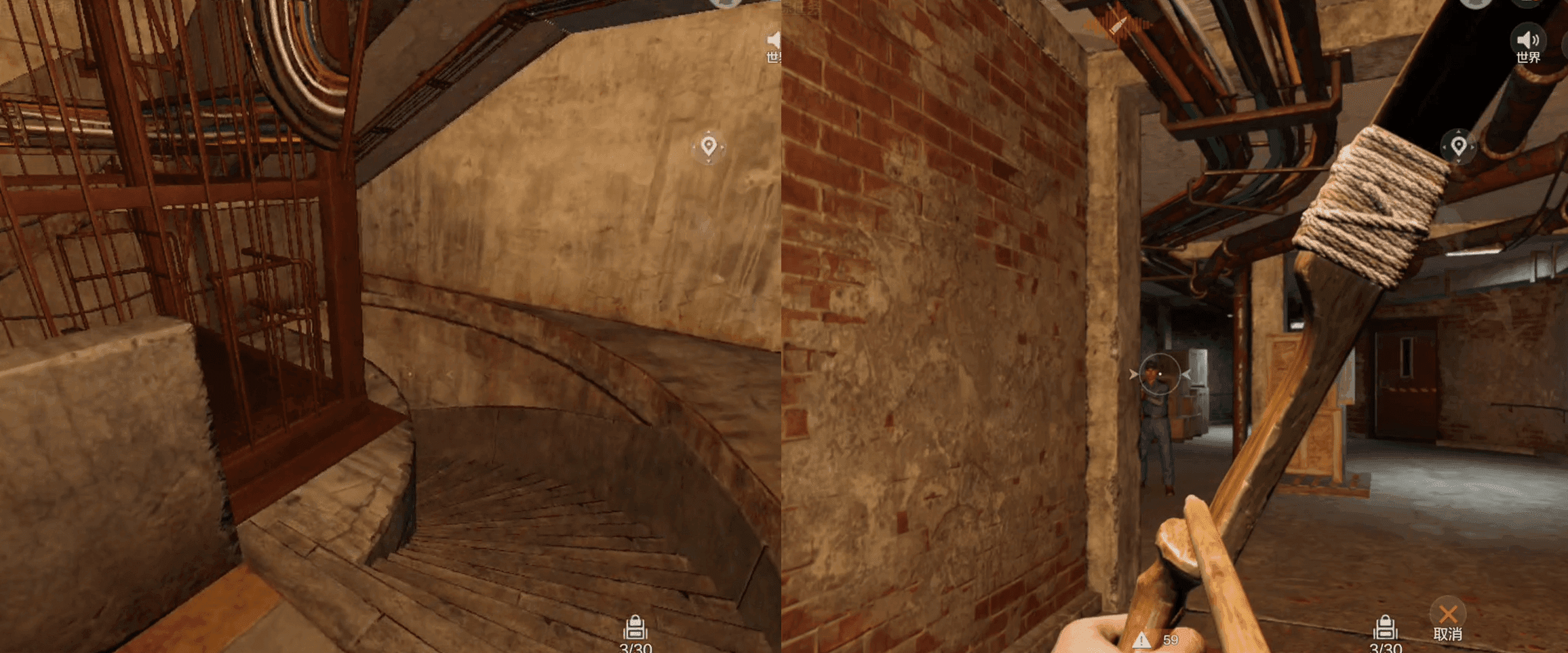 到达底层后,顺着旁边的台阶往下走,就能看到一扇红铁门,咱们直接打开进去。 重点提醒!门后有一节很长的走道,里面藏着4个NPC,还有不少物资箱,咱们用弓箭打,一定要卡着掩体打,别硬冲,打一下躲一下,节省弹药还不容易掉血,没血了就赶紧缠绷带,别硬扛,新手切记!