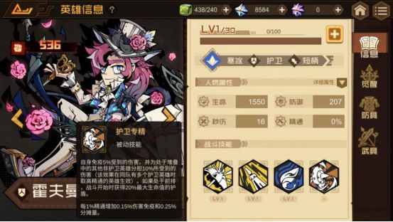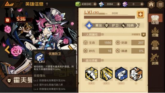 技能强化:Lv.2 防御强化效果提升至20%;Lv.3 提升全队英雄闪避几率;Lv.4 防御强化效果提升至24%