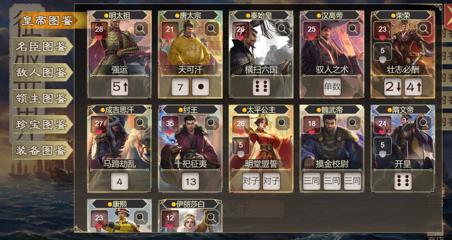 ◆ V0.26版本更新:12位皇帝主角、14位名臣、214位敌人、13位领主、210个珍宝
