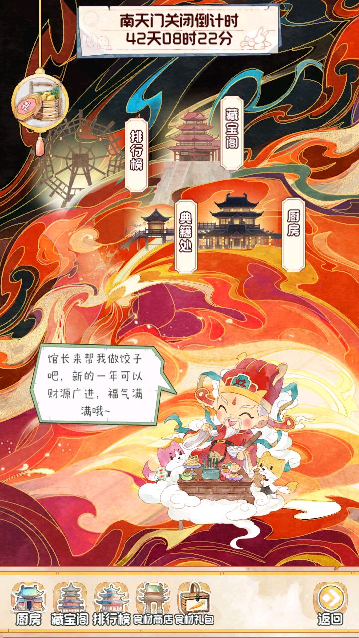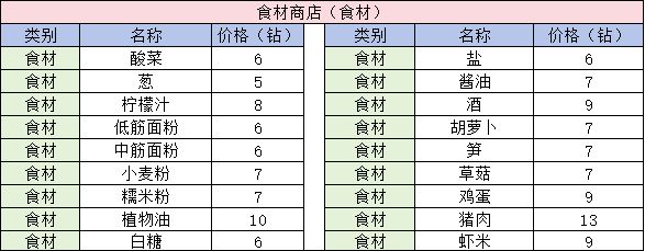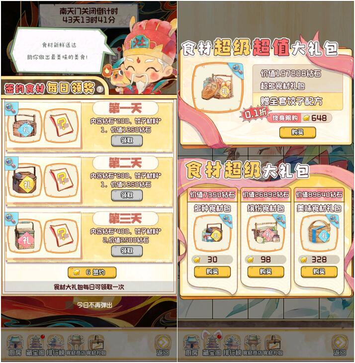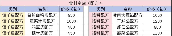 【食材】用于饺子皮&馅料制作,可以直接从厨房页面挑选食材补齐购买或者在食材商店花钻购买,此外每日特殊游客「灶王爷」可掉落食材礼包。