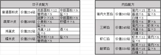 【饺子】一共有16种,使用不同的「饺子皮配方」+「馅料配方」消耗配方上指定的食材制作而成,制作不同的饺子可获得不等的积分。