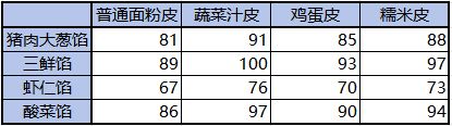 2、由于不同的饺子制作成功获得的积分不同,推荐馆长优先制作「蔬菜汁皮」+「三鲜馅」285+345=630钻获得100积分,制作不同的饺子获得积分如下图: