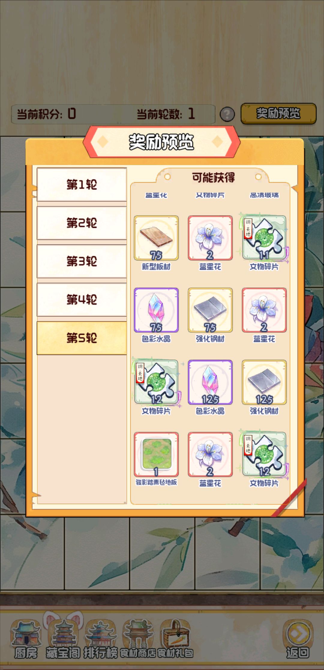 【活动面板】本次活动板块分为:厨房、藏宝阁、排行榜、食材商店、典籍处(与中秋活动类似),如下图: