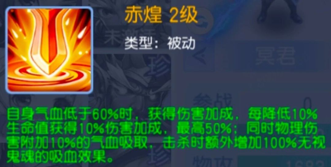 大家可以关注一下冥君的天赋被动技能。当气血低于60%时,它会获得伤害加成,每降低10%生命值,伤害加成提升10%,最高可达50%。