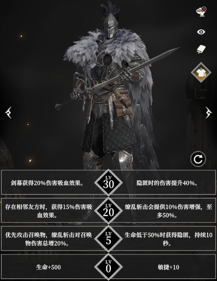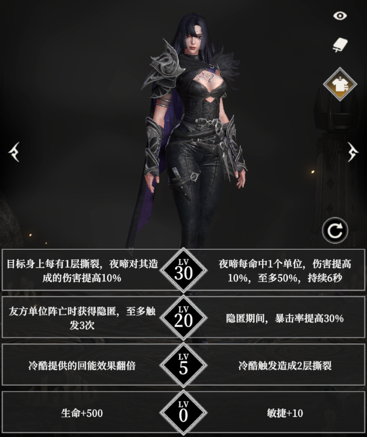 常规天赋加点推荐2222,最大程度地利用隐匿效果提高自身生存和伤害,在部分特殊场合会点出Lv5的左边天赋来调整攻击目标。
