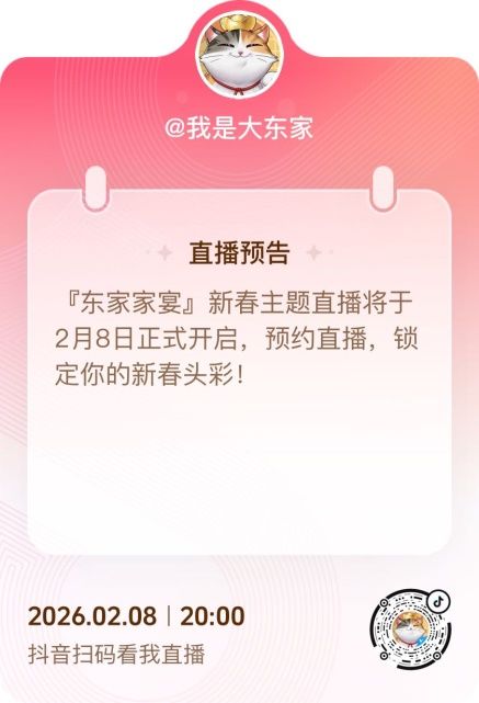 直播指路:2月5日至2月15日每晚20:00-24:00,前往官抖/视频号搜索「我是大东家」,或扫描下图前往直播间,即可观看直播!