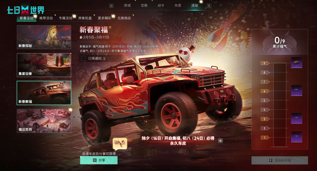 新春启岁,福气相逢!从除夕(2月16日)起,每日6:00您将自动获得1点福气,集福达到指定层数,即可免费领取永久紫色品质越野车载具外观“聚福”和永久紫色枪械外观!