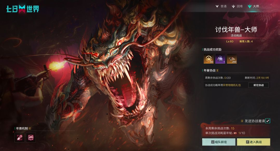 *组队/单人挑战每次消耗1张驱年帖和1次挑战次数。周次数上限为15次,每周一 6:00刷新。