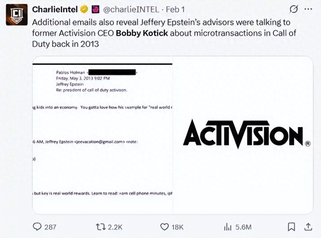 最早有记录在案的文件为2013年,他就与爱泼斯坦互通邮件,并讨论了在《使命召唤》系列游戏中引入微交易,以及“向孩子们灌输经济体系”的做法。要知道《使命召唤》系列游戏在北美可以算得上国民级游戏,有海量的青少年玩家。