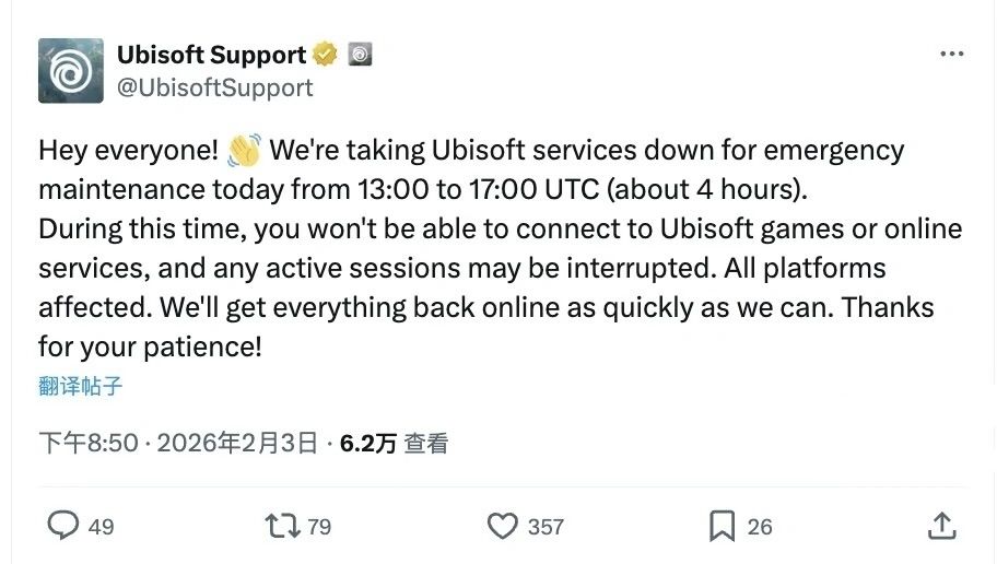 2月3日消息,育碧(Ubisoft)官方发布通知,将于北京时间2月3日21:00启动全平台紧急服务器停机维护,覆盖旗下多款核心在线游戏,预计维护至北京时间2月4日凌晨01:00结束,持续约4小时。