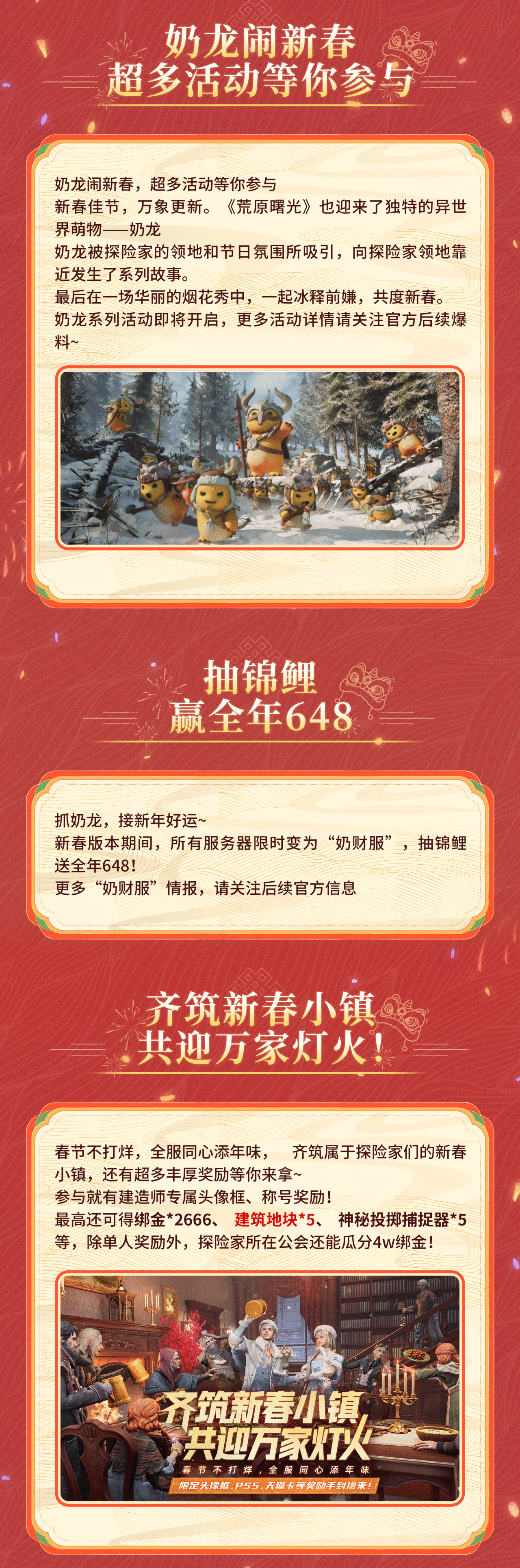 当怪潮突然消失,幸存者们重聚共建新年小镇筹备春节,一群来自异界的不速之客却登门闹新春——萌力战宠"奶龙"大军带着未知的祝福与危机登陆荒原!