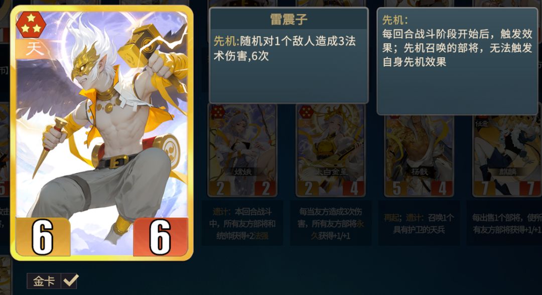 ①雷震子:先机法伤主力。雷震子能在开打前进行一波清场,前期任何阵营都可用来过渡,后期需搭配朱雀。