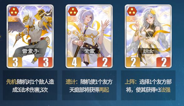 注:天庭和魏一样,需要养成,如果用勾践等“赌狗”统帅,建议搭配开场礼花/十连发,避免暴毙。