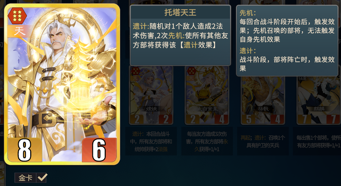 ①托塔天王:先机增强遗计。先机+遗计混搭流的核心。前期也可作为过渡。