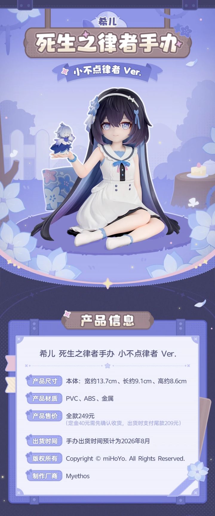 手办附赠花朵纹样靠枕,可自由摆放搭配,同款专属展示盒可同步购入,全高约86mm,材质为PVC&ABS,售价249元,预计2026年8月正式发售。