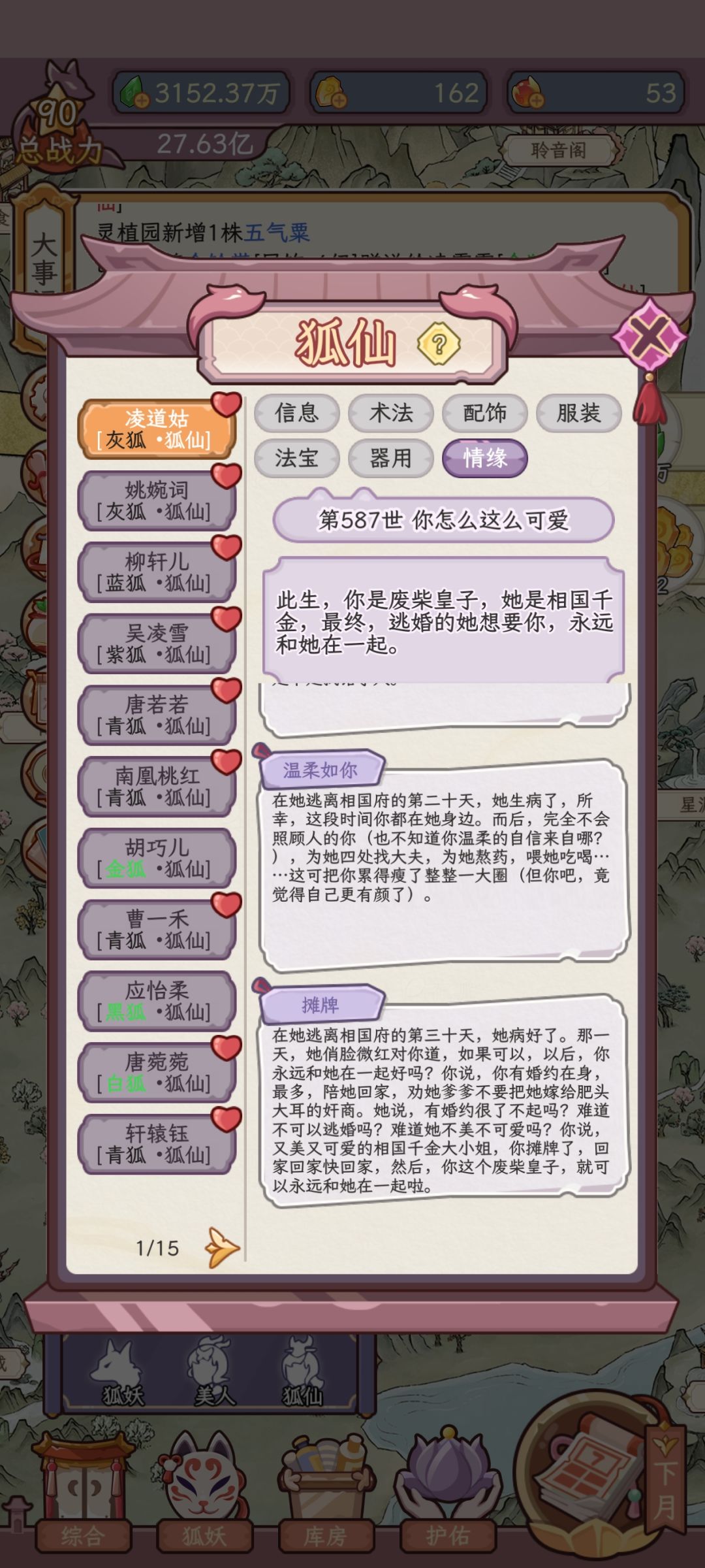 6,游戏让我玩下去的动力就是超可爱的立绘,还有这个相思树,我以为是能在一起的,结果只是让我们看一段小剧情,现在我还在慢慢培养这最后几只狐狸等化形了,我就把所有立绘给你们看