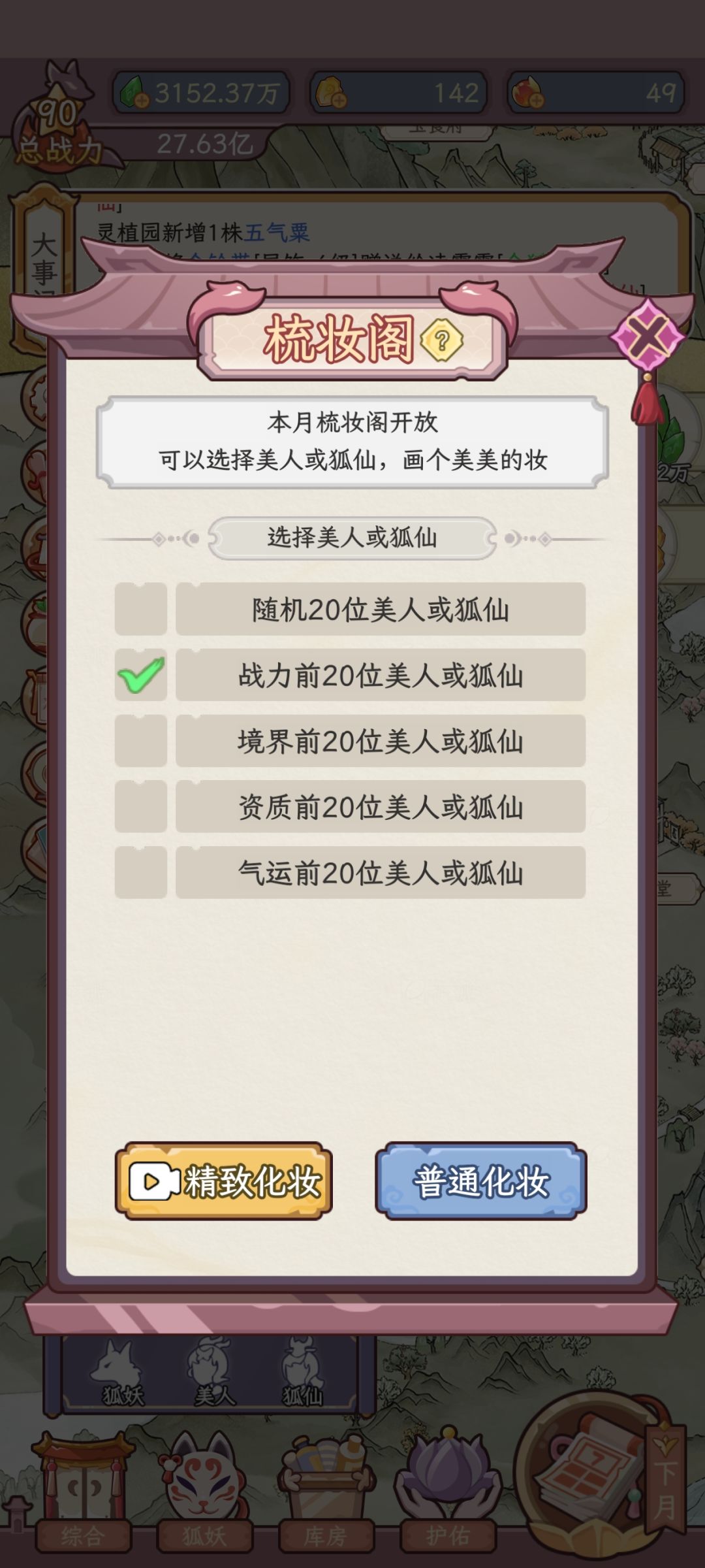 2(我图中的是开局给的狐狸,大概率给好天赋)就按这只狐狸培养,但缺点就是你真正想培养,就不能把她晋升为美人,不然她功法楼里的功法没学完就永远学不到了